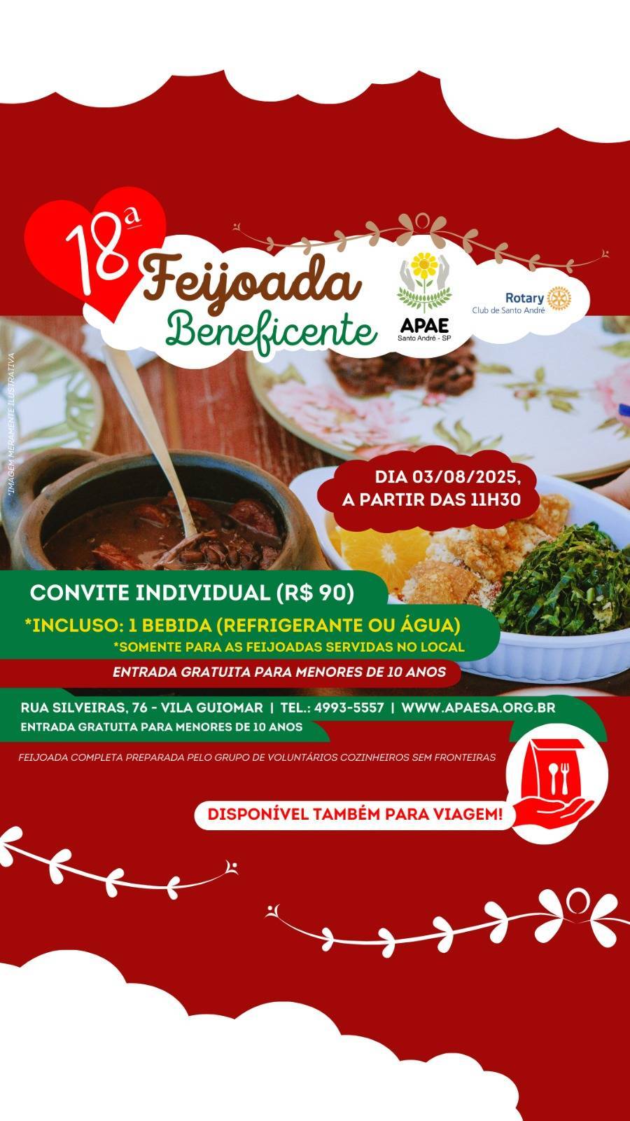 No próximo dia 3 de agosto de 2025, a partir das 11h30, acontece a 18ª edição da tradicional Feijoada Beneficente da APAE de Santo André, em sua sede na Rua Silveiras, 76 – Santo André. O evento, já consolidado no calendário solidário da cidade, tem como objetivo arrecadar fundos para a manutenção dos serviços prestados pela instituição.